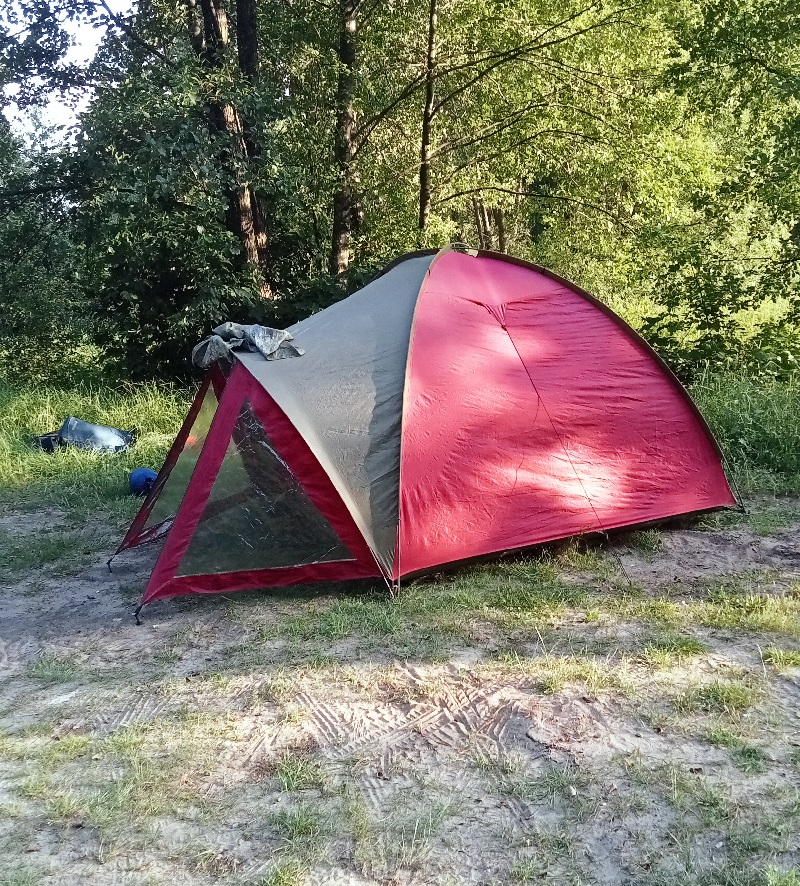 Namiot, który chyba pójdzie w odstawkę. Tutaj – rozbity w Bocheńcu nad Wierną Rzeką