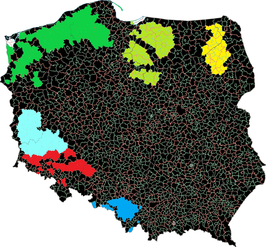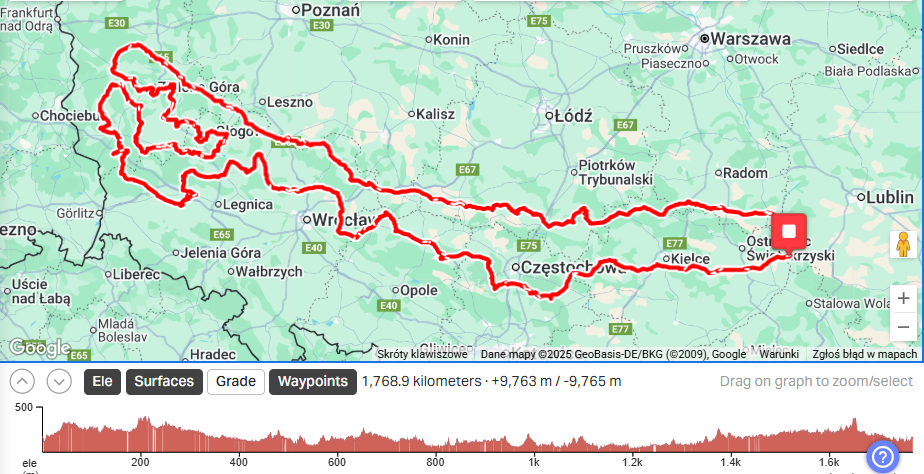 Pod spodem ostatnio zdobyte gminy w kolorze jasnoniebieściutkim i mapka trasy z dni 22.06 – 05.07.2025